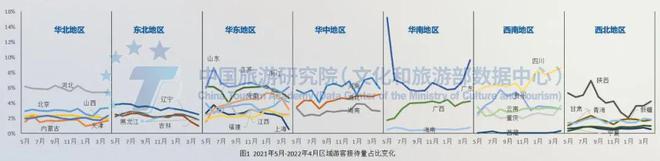 疫情散發及傳播鏈擴散打亂區域客流趨同特征,客流季節性弱化。除東北地區呈穩步收縮外,各區域旅遊客流變化趨同特征被散發疫情打亂,區域旅遊客流“淡旺季”特征弱化。對比來看,區域間客流差距依然存在,但華東地區絕對優勢弱化,華南及西南地區對國内遊客産出的貢獻有所提升。