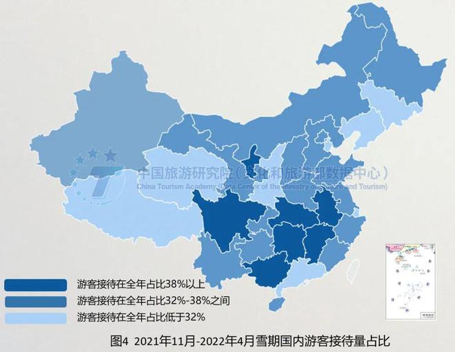 南方旅遊市場活躍度更高,冬奧會的冰雪旅遊帶動力因疫情受阻。從2021年5月至2022年4月各省市遊客接待量全國占比來看,大於2.53%的省市大多分布在南方,表明南方旅遊市場活躍度高於北方。去年11月至今年4月,雪期省域遊客接待量全國占2021年5月至2022年4月遊客量的比重平均約34.43%,“南下北上特征”不如往年明顯,四川、湖北、湖南等南方中部省份遊客接待占比較高。北方地區雖充分利用北京冬奧會機遇和區域自然資源優勢,圍繞冰雪運動、冰雪觀賞等提質擴容,但受疫情影響冬奧會對冰雪旅遊市場的帶動力沒能充分發揮。