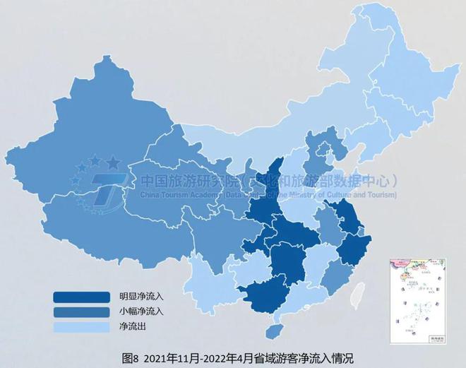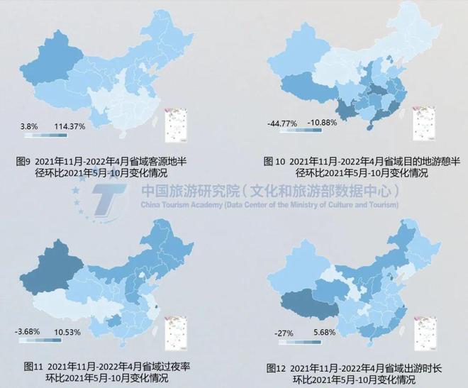 各地對疫情風險認知和出遊限制差異較大,總體表現爲北方大於南方。廣東、山東、陝西、貴州、遼甯、黑龍江、吉林、上海和天津等省市,2021年5月-10月居民出遊占比明顯高於2021年11月-2022年4月。受疫情影響,2021年11月-2022年4月省内居民出遊行爲受到抑制,出遊市場收縮幅度較大,河南、四川、湖北、安徽、雲南、廣西、湖南、江西等省份的居民出遊占比相對更高。總體而言,北方對疫情風險認知和出遊限制大於南方,南方城市遊客出遊需求轉化爲出遊實際出遊行爲更爲順暢。